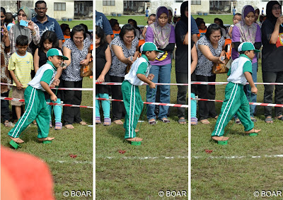 Hari ini Irfan masuk dua acara. Yang pertama adalah susun tin (arranging can) dan satu lagi acara berjalan menggunakan kasut penyu (walking with turtle shoe).