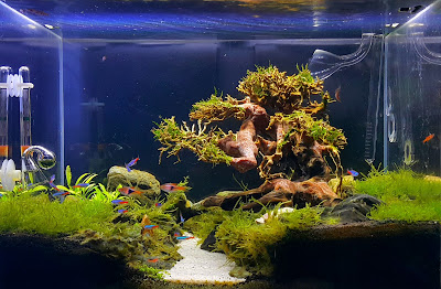Susun atur yang baru ini tidak memerlukan CO2, fertilizer untuk tumbuhan aqua. Penulis hanya perlu pastikan air sentiasa jernih dan kecergasan ikan-ikan yang menghuni di dalam tangki ini sahaja. Buat water change pun seminggu sekali sahaja. Setakat ini penulis cukup berpuas hati dengan hasil susun atur ini.